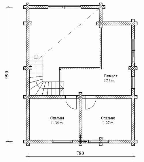 Большой двухэтажный дом для семьи из 3 - 4 человек. Вход в дом выполнен через два крыльца. Первое крыльцо располагается у фасадной части дома, второе с торца. Внутренняя планировка достаточно удобна и обширна. На втором этаже располагаются две спальни, а также галерея. На первом этаже располагается гостиная, одна спальня, кухня, котельная и санузел.