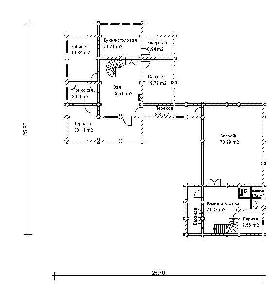 Прекрасный и просторный деревянный загородный дом. Этот проект можно назвать деревянным замком. Это целый жилой комплекс с бассейном, баней, пятью спальнями, кабинетом и другими комнатами, для отдыха и работы. Оригинальность проекта сочетается с прекрасным внешним видом и возможностью для удобного проживания семьи из 4-6 человек.